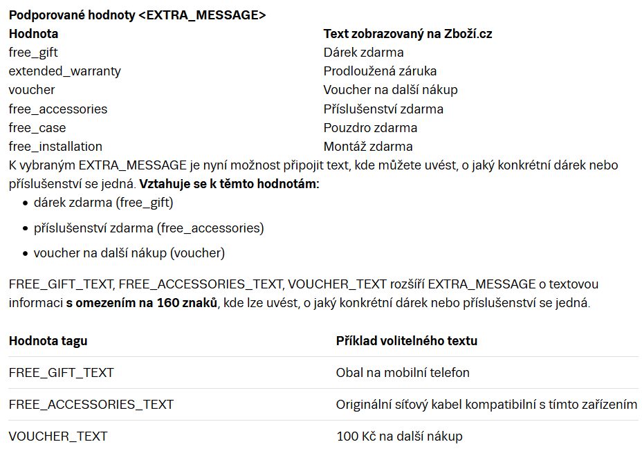 Na Zboží.cz je možné pomocí elementu EXTRA_MESSAGE uvádět doplňkové informace o produktu, přičemž EXTRA_MESSAGE je možné libovolně opakovat.
